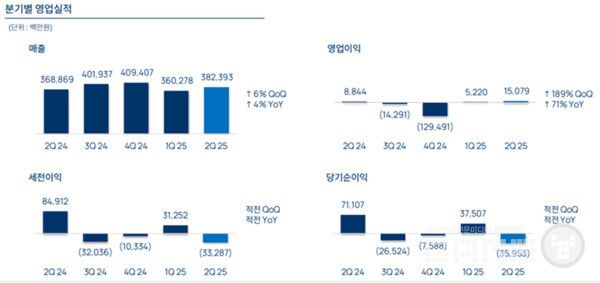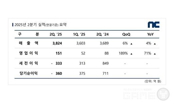 엔시소프트는 2분기 실적 결산 결과 매출 3,824억원, 영업이익 151억원, 당기순손실 360억원을 기록했다. 매출과 영업이익은 전분기 대비 6%, 189%가 증가하고, 전년 동기 대비로는 4%, 71% 상승했다. 당기순이익은 환율 변동으로 외화 관련 손익이 감소해 적자를 기록했다.
