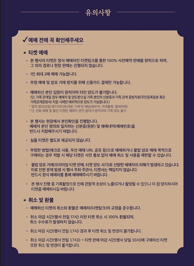 양도 불가: 예매한 티켓은 가족 외 타인에게 양도할 수 없으며 입장 시 본인 확인 절차가 있을 수 있음