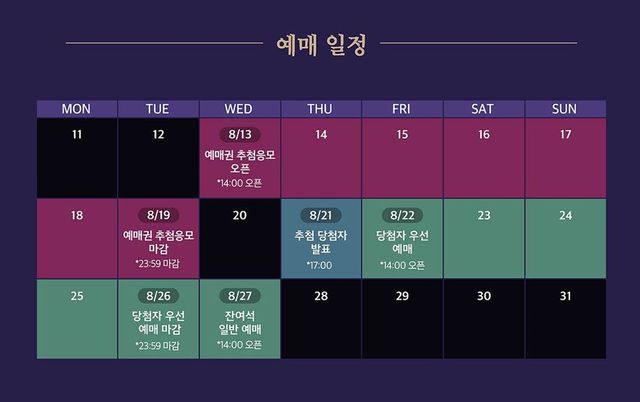 예매 방법은 우선 예매권 추첨제와 일반 예매(잔여석)로 나뉜다. 우선 예매권 추첨제는 티켓링크에서 오늘(13일) 오후 2시부터 오는 19일 오후 11시 59분까지 무료로 진행되며, 티켓링크 ID당 1회만 가능하다.