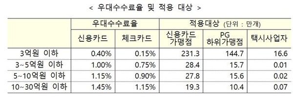 뉴시스 보도에 따르면, 13일 금융위원회는 하반기 신용카드 가맹점 306만8000개에 대해 우대수수료율이 적용된다고 밝혔다. 결제대행업체(PG사) 하위가맹점 186만4000개, 택시사업자 16만6000개에 대해서도 우대수수료율이 적용된다.