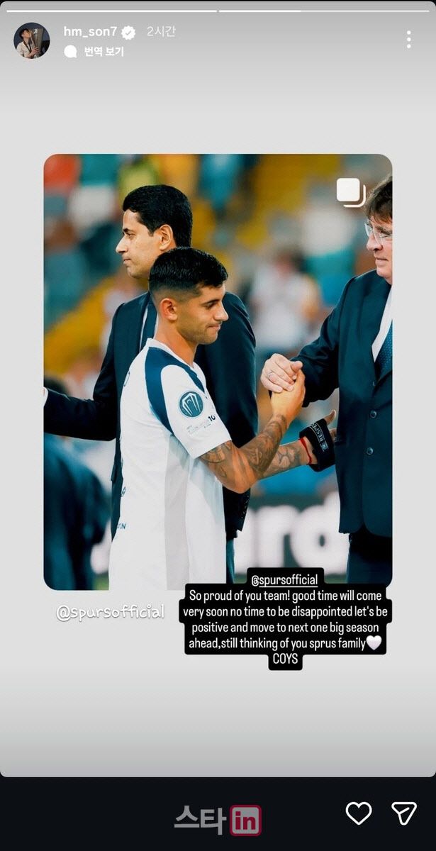 손흥민은 14일 자신의 SNS를 통해 “너희가 자랑스러워. 곧 좋은 시간이 찾아올 거야”라며 “실망할 시간은 없어. 긍정적으로 생각하고 이젠 또 다른 큰 시즌을 향해 나아가자”고글을 올렸다.