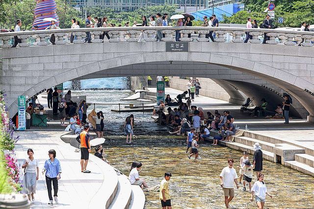서울중구 청계천에서 시민들과 외국인 관광객들이 모전교 그늘 아래에서 더위를 식히고 있다 / 뉴스1