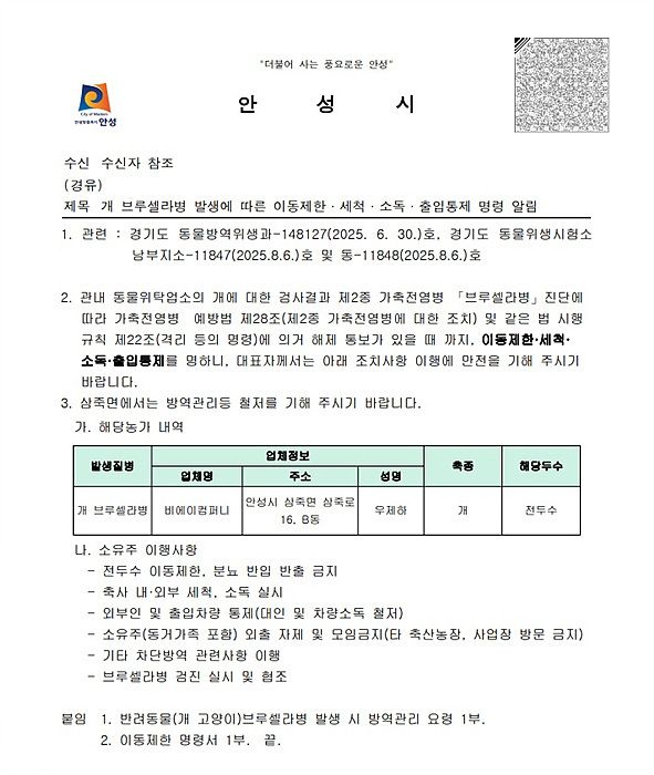 이 사실을 알게 된 직후 지자체 방역 당국에 신고했다. 브루셀라병은 ‘가축전염병 예방법’상 제2종 가축전염병으로, 확진뿐 아니라 의심 증상만으로도 즉시 신고해야 하는 질병이다. 가축 소유자, 관리자, 수의사 등은 감염이 의심될 경우 지체없이 관할 지자체나 방역 당국에 알리도록 법에 규정돼 있다.