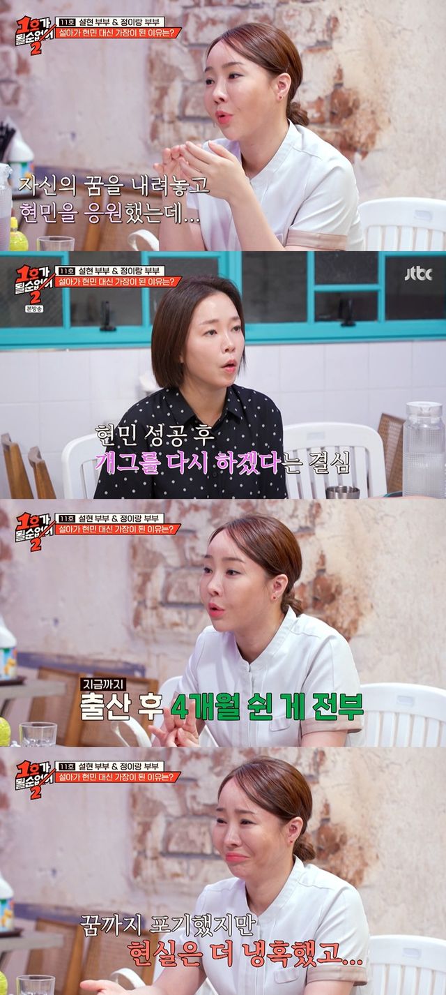 최설아는 "처음에는 아무렇지 않았다. 왜냐하면 '내가 선택한 남자니까, 내가 후회하면 안 된다. 내가 고른 이 사람한테 상처 주면 안 된다. 어떻게든 먹여 살리고 이 오빠가 편안하게 개그하게 해줘야지' 했는데 어느순간 갑자기 현타가 오는 거다. 길어지니까"라며 속 사정을 밝혔다.