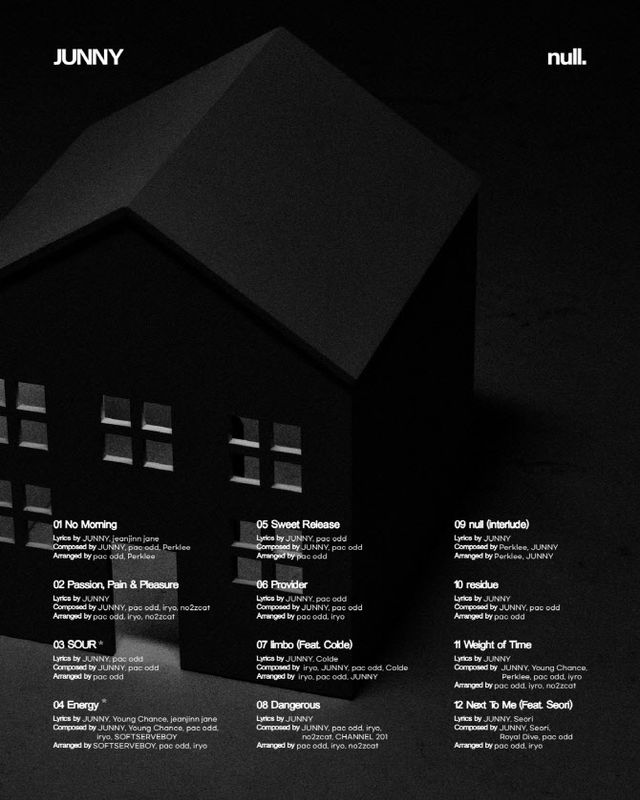 주니는 지난 14일 소속사 모브컴퍼니 공식 SNS를 통해 이번 앨범의 트랙리스트를 공개했다. 더블 타이틀곡은 ‘에너지’(Energy)와 ‘사워’(SOUR)이다. 이외에도 ‘노 모닝’(No Morning), ‘패션, 페인 & 플레저’(Passion, Pain & Pleasure), ‘스윗 릴리즈’(Sweet Release), ‘프로바이더’(Provider), ‘림보’(limbo) (Feat. 콜드(Colde)), ‘댄저러스’(Dangerous), ‘널 (인터루드)’(null (interlude)), ‘레지드’(residue), ‘웨이트 오브 타임’(Weight of Time), ‘넥스트 투 미’(Next To Me) (Feat. 서리(Seori))까지 총 12곡이 수록됐다.