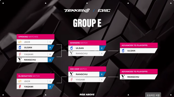 ▲사진 출처=EWC 철권8, E조는 한국인 3명과 야가미의 조합. 진출자는 울산과 랑추