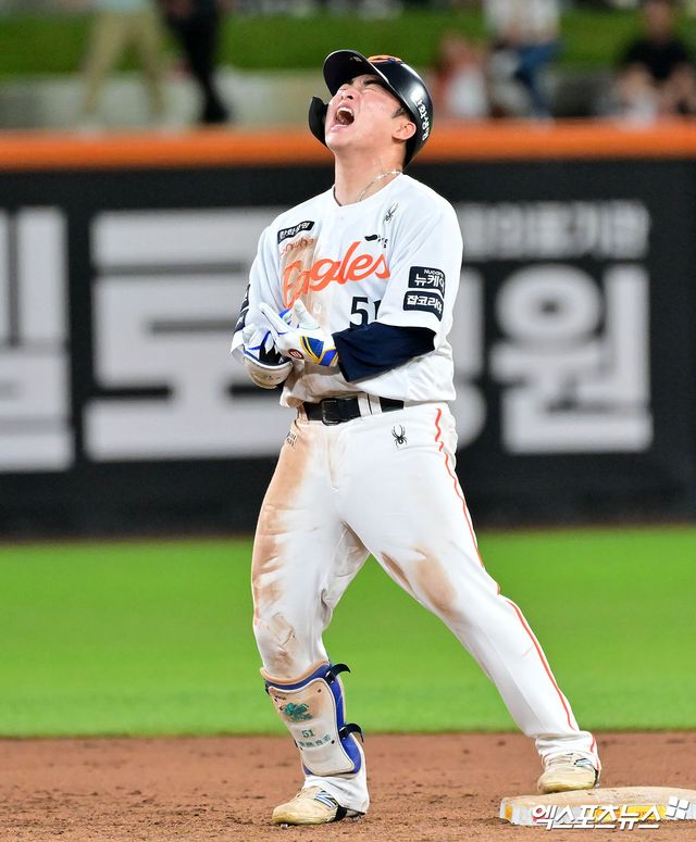 2사 주자 없는 상황 KT 이상동 상대, 볼카운트 1-1에서 3구 145km/h 직구를 받아친 문현빈은 우중간 담장을 넘어가는 솔로 홈런을 만들어냈다. 문현빈의 시즌 10호 홈런. 2023년 데뷔한 3년 차 문현빈의 첫 두 자릿수 홈런을 완성하는 대포였다. 문현빈은 그라운드를 돌며 크게 포효했다.
