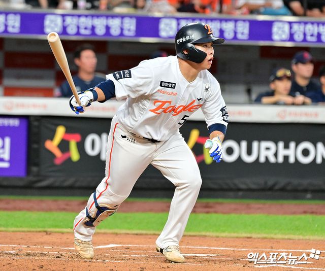 지난 5일 대전 한화생명 볼파크에서 열린 KT 위즈와 한화의 경기, 이날 3번타자 겸 좌익수로 선발 출전한 문현빈은 팀이 1-0으로 앞서있던 7회말 홈런을 터뜨렸다. 7월 1일 대전 NC전 이후 36일 만에 나온 홈런.
