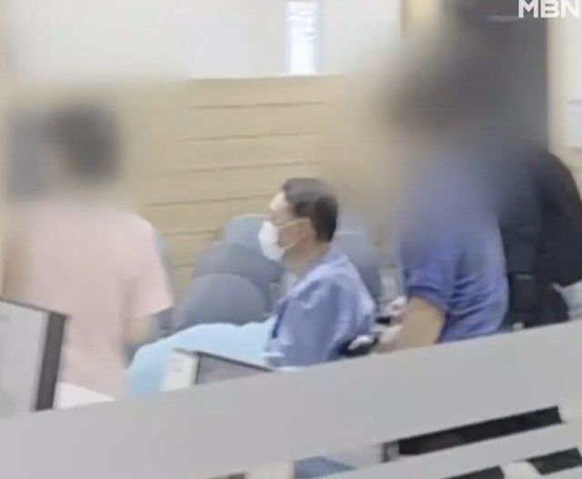 지난 14일 오전 경기 안양시 한림대병원을 찾은 윤석열 전 대통령의 모습이 MBN에 포착됐다. 휠체어를 탄 윤 전 대통령은 마스크와 미결 수용복으로 추정되는 파란 옷을 입은 채 다리에 담요를 덮고 있는 모습이다 (사진=MBN 뉴스 영상 캡처)