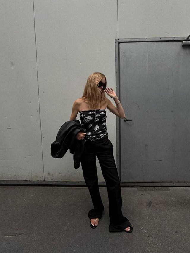 메가 인플루언서들 역시 옷장에서 블랙 팬츠를 눈에 띄는 위치로 옮겼답니다. 사틴 소재의 플레어 팬츠에 푹 빠진 페르닐 테이스백은 2000년대 초반 스트리트 패션을 강렬하게 흔들어 놓았던 해골 스카프와 함께 블랙 팬츠를 입었습니다. 바지 끝단이 약간 끌리도록 길이를 여유 있게 잡은 다음 플립플롭을 신은 게 포인트!