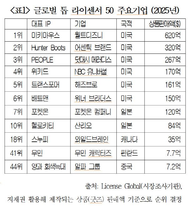 실제, 월트디즈니는 미키마우스 등 슈퍼 IP를 활용해 의류, 유명 유통사 등과 콜라보를 진행해 지난해 약 620억달러(약 86조원)의 상품판매를 기록했다. 미국은 5위 해즈브로(트랜스포머 등, 161억달러), 6위 워너 브라더즈(배트맨 등, 150억달러) 등이 IP를 활용해 다양한 사업영역에서 수익을 창출하고 있다. 미국 톱 라이센서 32개사의 IP에서 파생된 수익은 약 2424억5000만달러(약 338조원)로 같은해 한국 국내총생산(GDP)의 13% 수준에 달한다. 아이디어, 소프트파워 등으로 막대한 돈을 벌고 있다.