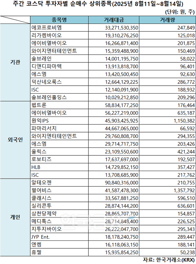 기관 '에코프로비엠'·외인 '펩트론'·개인 '알테오젠' 1위 [주간 코스닥 순매수- 2025년 8월11일~8월14일]