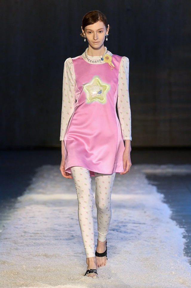 뉴욕 디자이너 샌디 리앙(Sandy Liang)은 늘 ‘소녀 시절의 기억’에서 출발한다. 이번 2025 가을/겨울 컬렉션 역시 예외는 아니었다. 핑크빛 다이어리, 낙서 가득한 플래너, 유년기의 낙서 같은 단서들이 런웨이를 가득 채운 가운데, 특히 눈길을 끈 건 한국의 ‘행운의 별’ 종이접기에서 영감을 받은 룩이었다.