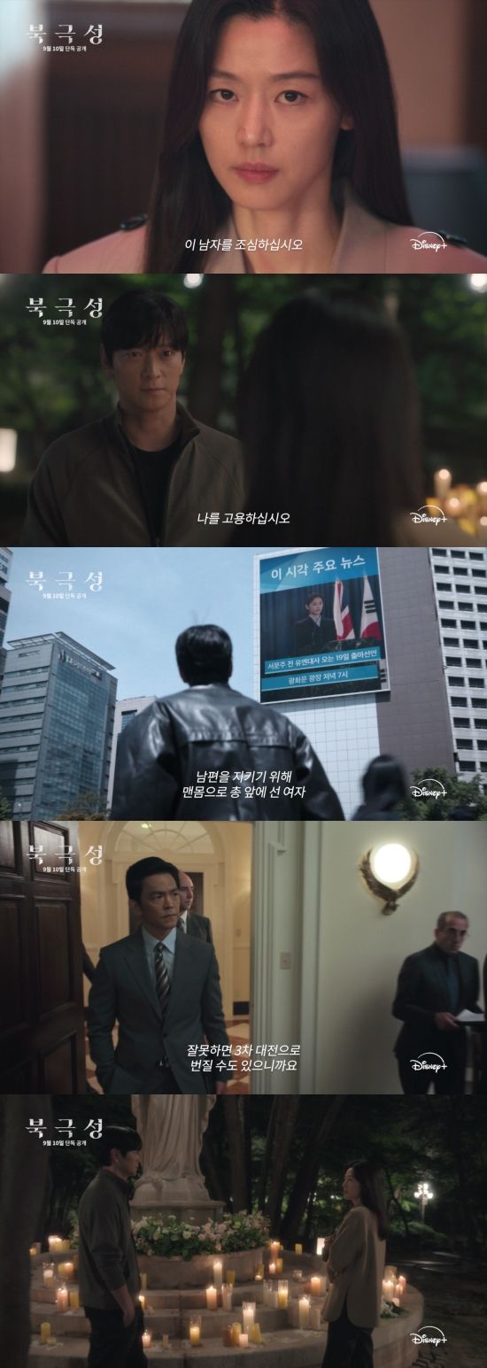 메인 예고편은 '북극성'의 압도적인 스케일과 곳곳에 도사리는 위협 속에서 숨겨진 진실을 향해 나아가는 인물들이 만들어낼 드라마에 대한 기대를 한껏 높인다. 대한민국을 뒤흔든 대통령 후보 피격 사건의 배후를 파헤치고자 대선 출마를 결심한 문주는 목숨을 위협하는 위험한 사건들에 휘말리게 된다.