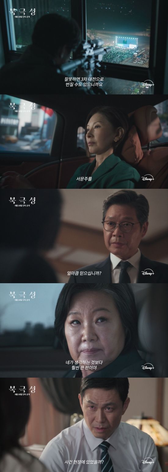 여기에 3차 대전으로 번질 수도 있을 거대한 위험이 한반도에 조금씩 가까워지고, 폭풍우의 방향을 조금이라도 바꾸고자 애쓰는 미 국무부 차관보 앤더슨 밀러(존 조)와 대통령의 자리에서 최선을 다하는 대한민국 대통령 채경신(김해숙), 대한민국의 정재계를 주무르는 영향력 있는 아섬해운의 회장 임옥선(이미숙), 대선 출마 야망을 가지고 문주를 쫓는 검사 장준상(오정세)까지. 전 세계의 안전을 위협하는 진짜 배후가 누구인지, 또 다가오는 폭풍우는 무엇을 상징하는지 호기심을 자극하는 가운데 문주는 “이 모든 걸 움직이는 각본이 따로 있다면, 내가 알아내요”라며 강한 다짐을 보여주고 있어 시청자들의 호기심을 자극한다. 이들을 둘러싼 한 치 앞도 예측할 수 없는 스토리와 각자의 욕망을 가지고 앞으로 달려가는 캐릭터들의 팽팽한 대립은 '북극성'을 향한 전 세계의 기대감을 한껏 끌어올린다.