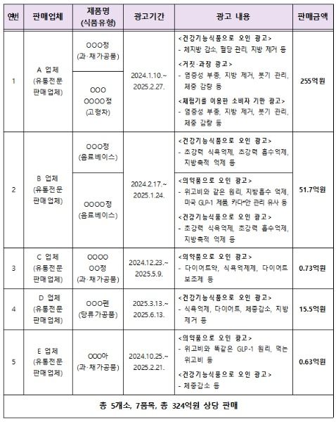 식품의약품안전처(처장 오유경)는 19일, SNS와 유튜브 등에서 과·채가공품 같은 일반식품을 ‘먹는 위고비’, ‘식욕억제제’ 등으로 허위 광고하고 총 324억 원어치를 판매한 5개 업체 대표를 검찰에 송치했다고 밝혔다.