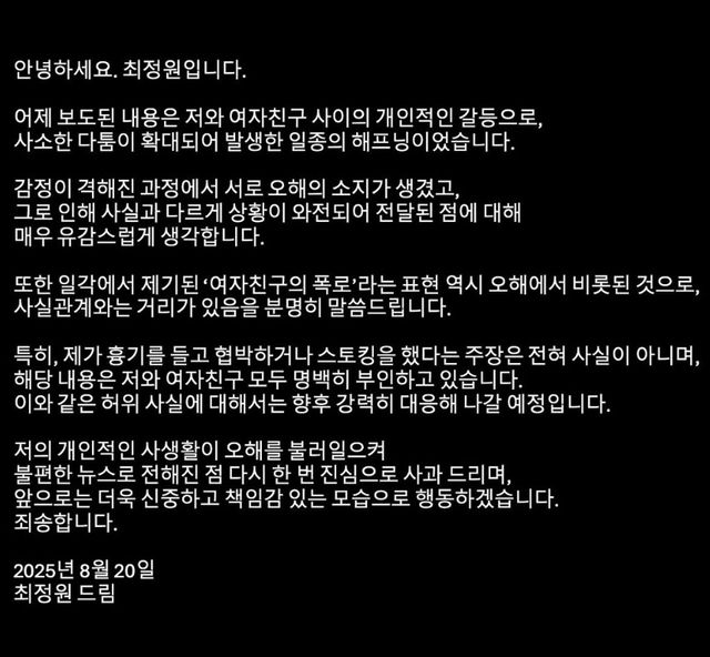 최정원은 “제가 흉기를 들고 협박하거나 스토킹을 했다는 주장은 전혀 사실이 아니며, 해당 내용은 저와 여자친구 모두 명백히 부인하고 있다”며 허위 사실에 대해서는 강력히 대응하겠다고 전했다.