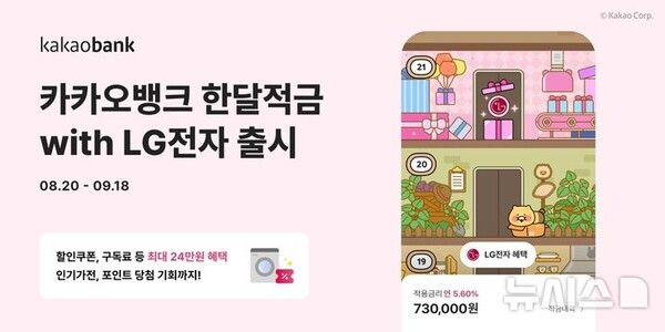 카카오뱅크는 한 달간 꾸준히 저금하면 LG전자 가전 구매와 구독료 지원 등을 받을 수 있는 '한달적금with LG전자'를 출시한다고 20일 밝혔다.
