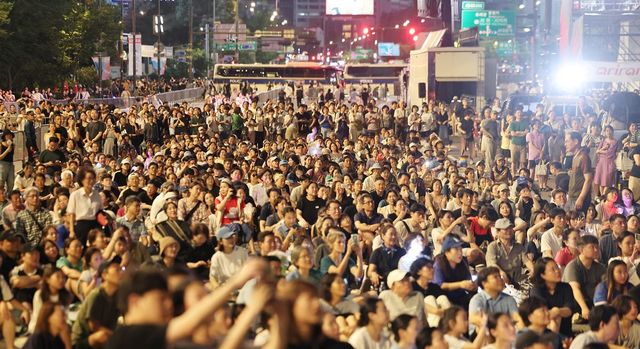 광복 80주년인 15일 저녁 서울 광화문광장에서 열린 제21대 대통령 국민임명식 행사장이 인파로 붐비고 있다. 기사 이해를 돕기 위한 자료 사진.우정사업본부는 이재명 대통령 취임 100일을 맞아 발행하는 기념우표의 사전 예약 물량이 예약 첫날 완판됐다고 20일 밝혔다. / 연합뉴스