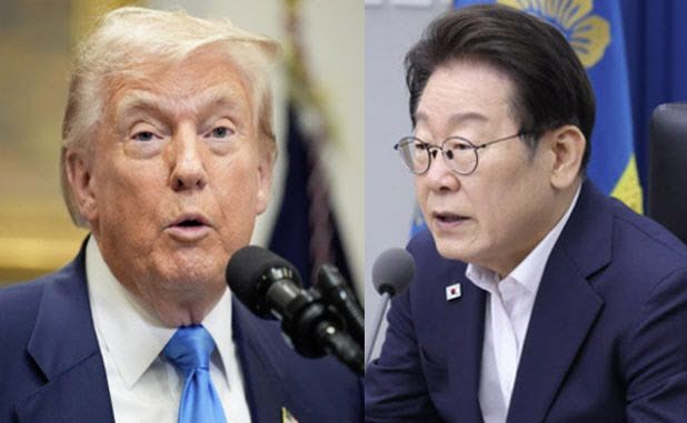 이재명 대통령과 도널드 미국 트럼프 대통령이 지난달 6일 양국 정산 간 첫 통화를 하고 있다.(사진=연합뉴스, AFP)