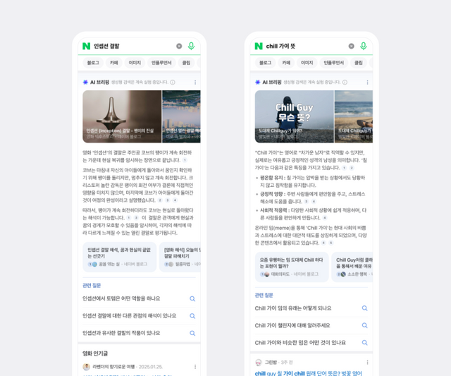 네이버의 대표 AI 검색 서비스인 AI 브리핑은 사용자의 검색 의도에 맞춰 다양한 주제의 문서를 분석·요약해 제공한다. AI가 생성한 요약뿐 아니라 답변의 출처까지 자연스럽게 탐색할 수 있는 것이 특징이다. 블로그·카페·클립 등 네이버 생태계 내 최신 콘텐츠를 활용하기 때문에 국내 최신 트렌드와 한국 문화에 최적화된 정보를 제공한다.