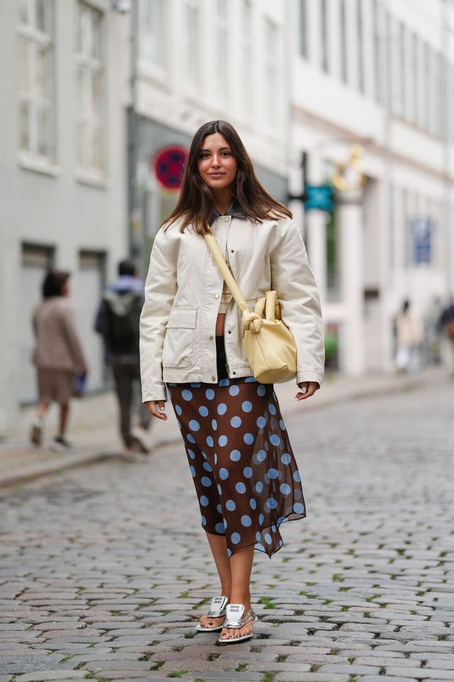 아이보리 재킷은 어떤 스타일이든지 부담 없이 녹아드는 기본 아이템입니다. 이너로는 살이 살짝 드러나는 크롭 톱을 매치하고, 시스루 도트 스커트로 가벼운 개성을 더했네요. 투명한 소재와 무게감 없는 재킷이 만나니 룩에 리듬감이 한결 더해진 듯합니다. 옐로 톤 백처럼 따뜻한 기운도 함께 얹어주면 가을이라는 계절감도 물씬 묻어나고요. 가을을 경쾌하게 맞이하는 똑똑한 믹스 매치 기술이죠.