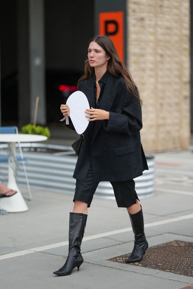 블랫 재킷과 부츠의 시크한 조합도 포기할 수 없죠. 오버사이즈 블랙 재킷에는 단숨에 시선을 끌어당기는 힘이 있습니다. 안에는 블랙 셋업을 매치해, 힘 있는 모노톤 무드를 완성했네요. 무릎 위까지 오는 부츠도 재킷의 기장과 맞물리며 드라마틱한 라인을 완성하고요. 자칫 무거워질 수 있는 블랙 톤이 스트리트 위에서 당당함으로 재해석되는 순간이네요!