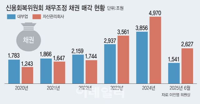 21일 신용회복위원회가 국회 정무위원회 이인영 더불어민주당 의원실에 제출한 자료를 이데일리가 입수해 분석한 결과 채무조정 채권의 매각 규모는 최근 몇 년 새 급증했다. 지난해 한 해에만 대부업으로 매각된 채권이 3조 8557억원(49만6033건), AMC로 매각된 채권은 4조 9698억원(64만6832건)에 달했다. 불과 3~4년 전(2020년) 대부업 매각액 1조 7831억원, AMC 매각액 1조 2433억원과 비교하면 두 배 이상으로 불어난 수치다.