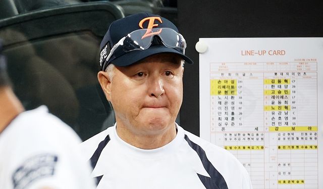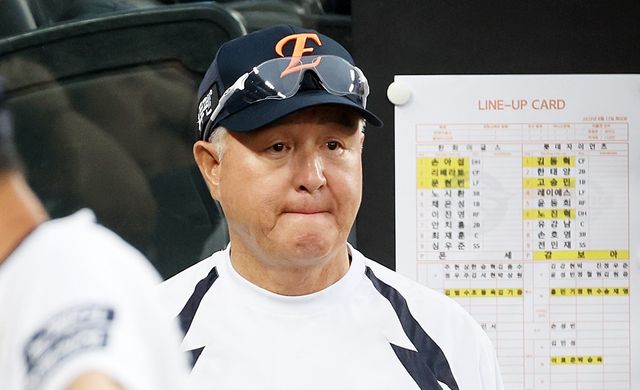 한화 이글스를 이끄는 김경문 감독. 기사 이해를 돕기 위한 자료 사진. 21일 대전에서는 리그 9위 두산 베어스가 리그 2위 한화 이글스를 6-3으로 제압하고 7연승을 달렸다. 반면 한화 이글스는 이날 경기 패배로 5연패를 기록했다. 김경문 감독이 이끄는 한화 이글스가 충격의 5연패에 빠진 사이, 염경엽 감독이 이끄는 리그 1위 LG 트윈스와 게임차는 어느덧 4.5경기로 벌어졌다. / 연합뉴스