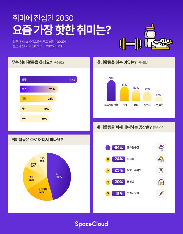취미활동을 주로 하는 장소는 집(46%)이 가장 많았으며, 공간대여(20%), 야외(16%), 카페(9%)가 그 뒤를 이었다. 취미활동을 위해 대여하는 공간은 댄스연습실(64%, 복수응답)이 1위를 차지했고, 파티룸(24%), 촬영스튜디오(23%), 공연장(20%)도 많이 빌리는 것으로 조사됐다. 커버댄스를 연습하고 영상을 촬영하는 일이 대중화되고, 파티룸에 모여 영상을 감상하거나 독서모임을 하는 등 취미를 위해 공간대여를 적극 활용하는 경향이 이번 설문조사로 확인됐다.