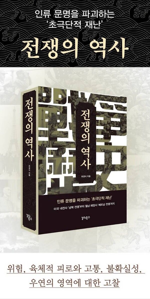 전쟁은 인류 역사에서 수없이 발발해왔다. 그로 인해 역사가 크게 뒤바뀌는 일도 많았다. 이를 반영하듯 최경식 작가의 신간 '전쟁의 역사'는 역사적 변곡점이 된 주요 전쟁 10가지를 담고 있다. 이 책은 미국 남북 전쟁, 러일 전쟁, 제1차 세계대전, 중일 전쟁, 제2차 세계대전 서부 전역, 독소 전쟁, 태평양 전쟁, 국공 내전, 한국 전쟁, 베트남 전쟁 등을 다루며 전쟁의 원인, 전황, 파급 효과 등을 세밀하게 그려냈다.