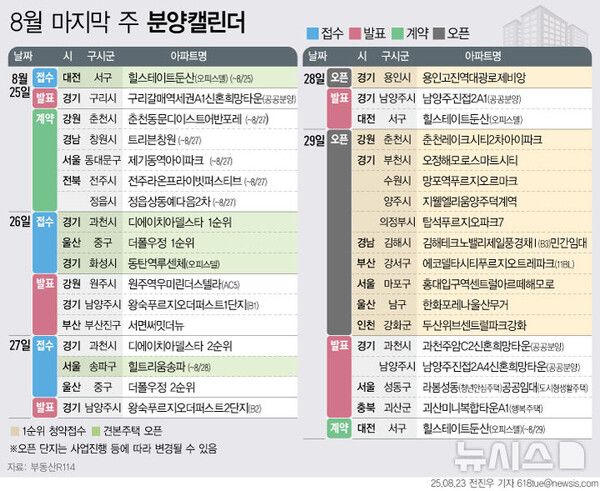 8월 마지막 주 전국에서 5개 단지 총 1936가구가 분양을 시작한다. 이중 일반분양 물량은 1343가구 규모다.