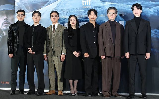 배우 현빈(왼쪽부터)과 박정민, 조우진, 전여빈, 박훈, 유재명, 이동욱이 지난해 11월 27일 서울 용산구 CGV용산아이파크몰에서 열린 영화 '하얼빈'(감독 우민호) 제작보고회에 참석해 포즈를 취하고 있다. '하얼빈'은 1909년, 하나의 목적을 위해 하얼빈으로 향하는 이들과 이를 쫓는 자들 사이의 숨 막히는 추적과 의심을 그린 작품이다 / 뉴스1
