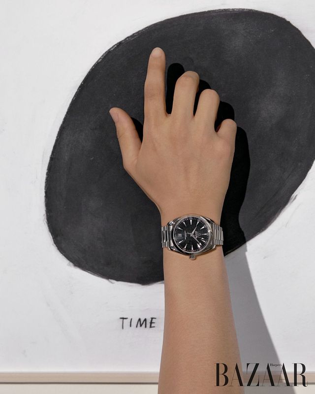 샤넬이 착용한 코-액시얼 이스케이프먼트가 장착된 문샤인™ 골드 케이스의 옐로 컬러 다이얼 ‘씨마스터 아쿠아 테라 30MM’ 워치는 4천4백만원대 Omega.