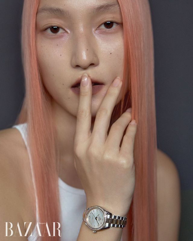 샤넬이 착용한 코-액시얼 이스케이프먼트가 장착된 스틸 및 세드나 골드 케이스의 브라운 컬러 다이얼 ‘씨마스터 아쿠아 테라 30MM’ 워치는 1천6백만원대 Omega.