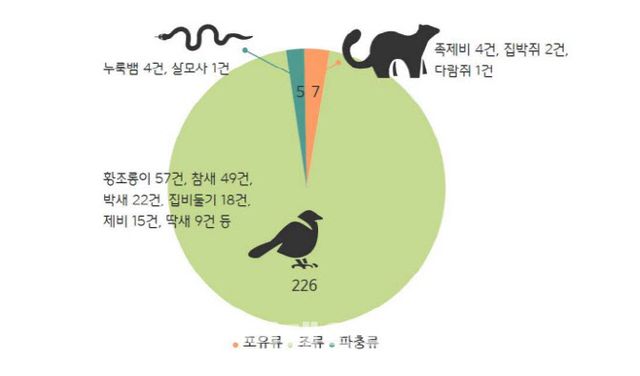 충남야생동물구조센터에 따르면 2011년 1월부터 올해 7월까지 쥐 끈끈이 피해 동물은 총 238개체입니다. 이 중 226개체가 조류로 대부분을 차지하고 있으며 쥐가 아닌 포유류가 7개체, 파충류가 5개체를 차지하고 있습니다.