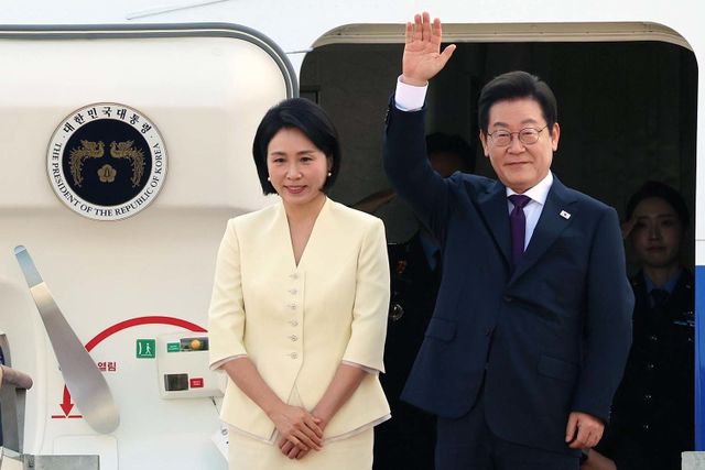 이재명 대통령과 부인 김혜경 여사가 일본·미국 정상과 순차 정상회담 참석을 위해 23일 오전 경기도 성남 서울공항을 통해 출국하며 인사를 하고 있다. / 뉴스1