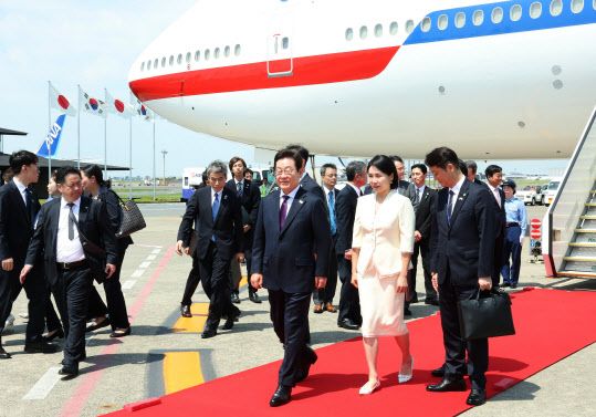 대통령 전용기가 착륙한 뒤 이 대통령은 김 여사와 함께 계단을 천천히 내려와 환영 인사들과 차례로 악수했다. 일본 측 인사들은 허리를 굽히며 맞이했고, 일부는 환하게 웃으며 대화를 나눴다. 김 여사 역시 뒤이어 환영 인사들과 인사를 나눴다.