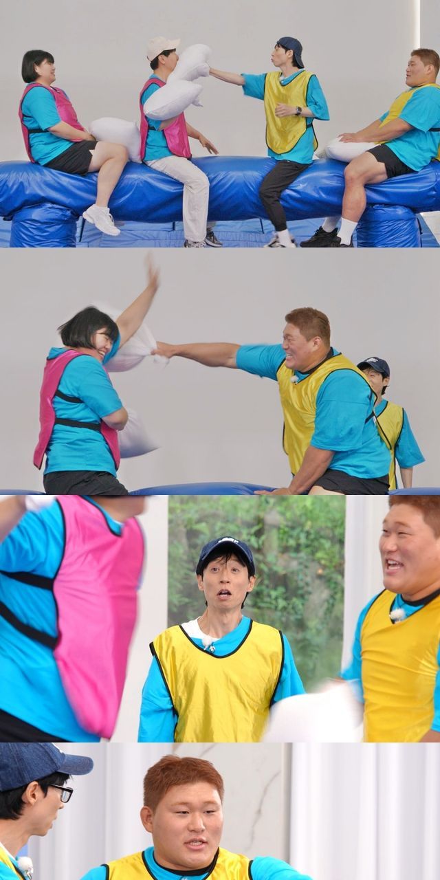최근 진행된 녹화는 '런닝체대 상품대첩'으로 꾸며져 체대생으로 변신한 멤버들은 벌칙을 피하기 위한 상품 쟁탈전에 나섰다. 상품 응모 기회는 물론 점심 메뉴까지 걸고 벌인 베개 싸움은 퀴즈까지 더해져 힘과 머리를 동시에 써야 하는 상황이 연출됐다. 이때 유재석과 지석진은 30년 우정에 끝장을 보겠다는 듯 "먼저 우는 사람이 지는 거야"라며 쉴 틈 없이 서로의 얼굴을 한 대씩 가격하며 피 터지는 대결을 벌였다. 런닝맨의 공식 '약한 아이'인 두 사람답지 않은 진검승부에 과연 조금 더 강한 아이는 누구였을지 호기심을 모은다. 그런가 하면 '피지컬 최강자' 김민종과 김하윤은 힘으로는 적수가 없었지만, 퀴즈에서만큼은 깡깡이 본색을 드러내 한순간 에이스에서 구멍으로 전락하며 또 한 번 모두를 웃음 짓게 할 반전 매력을 예고했다.