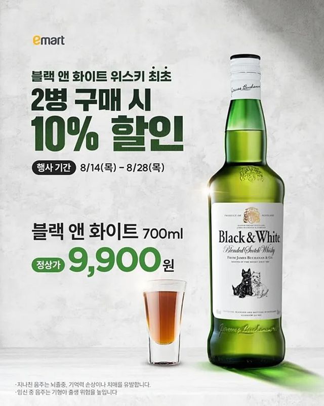 이마트가 '블랙 앤 화이트(700ml)' 위스키 할인 행사를 진행한다. 해당 위스키는 이마트에서 9900원에 판매하고 있다. 타 유통업계에서 1만 원 중후반대로 판매된 상품이었으나 1만 원도 안되는 가격으로 판매하는 것이다.