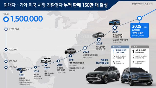 현대차·기아는 2011년 미국 친환경차 시장 진출 이후 11년만인 2022년 누적 판매 50만대를 돌파했으며 그로부터 2년 뒤인 2024년에는 100만대, 지난달에는 150만대라는 대기록을 달성했다.