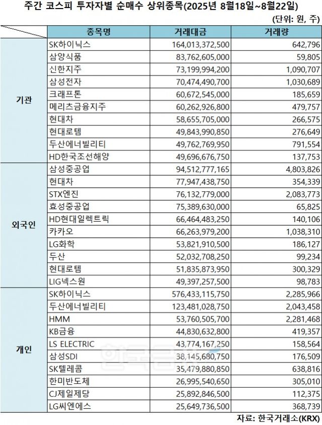 기관 'SK하이닉스'·외인 '삼성중공업'·개인 'SK하이닉스' 1위 [주간 코스피 순매수- 2025년 8월18일~8월22일]