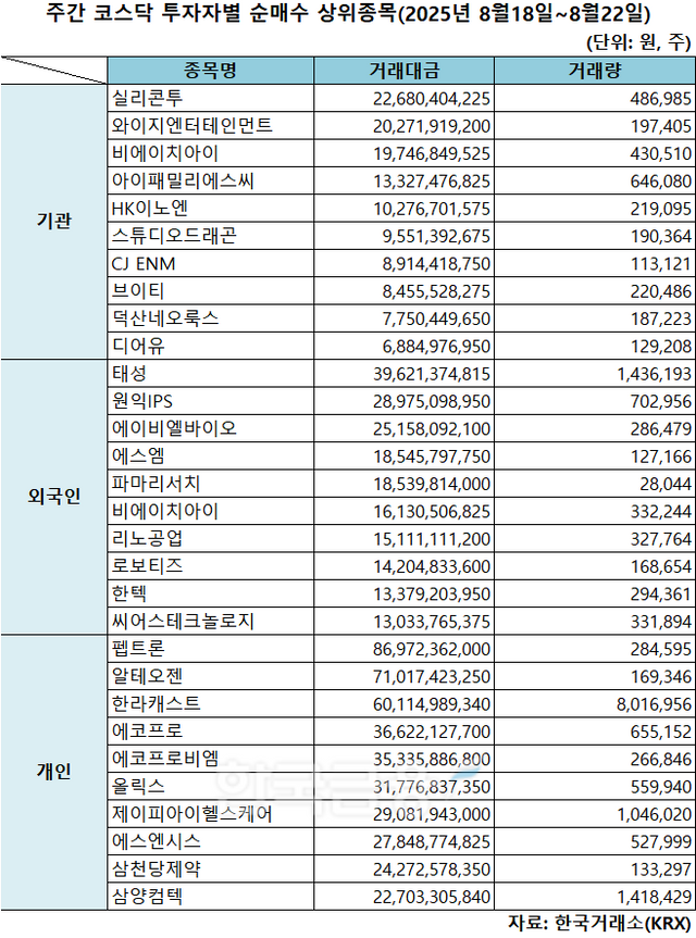 기관 '실리콘투'·외인 '태성'·개인 '펩트론' 1위 [주간 코스닥 순매수- 2025년 8월18일~8월22일]
