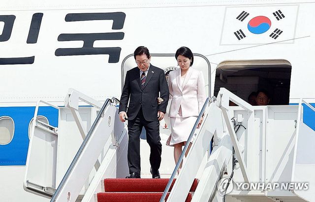 이재명 대통령과 김혜경 여사가 24일(현지시간) 미국 워싱턴DC 인근 앤드루스 합동기지에 도착해 공군 1호기에서 내리고 있다 / 연합뉴스