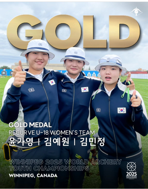 ▲ 캐나다 위니펙에서 열린 '2025 세계유스양궁선수권대회'에서 윤가영, 김예원, 김민정 선수가 리커브 U-18 여자 단체전에서 금메달을 거머쥐었다. 대한양궁협회 제공