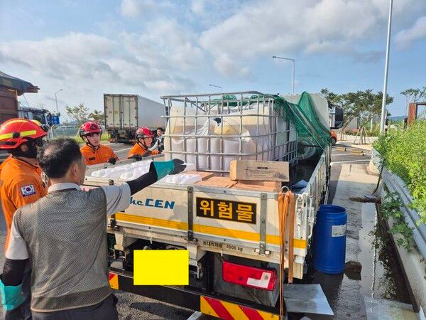 이어 소방당국은 차량에 적재된 3450~3500ℓ 수산화나트륨 용액 전량을 새 탱크로 옮겼다.