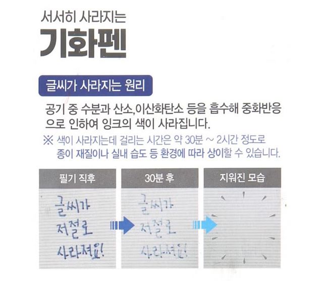 기화펜 원리. 기화펜은 특수 잉크를 사용해 일정 시간이 지나면 글씨가 자연스럽게 사라지는 특징이 있다. / 다이소 제공