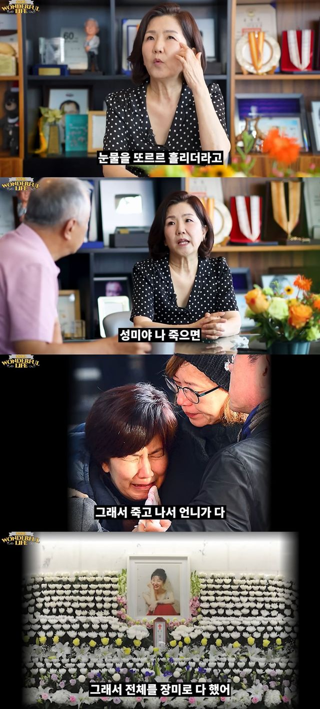 더불어 이성미는 "그러면서 죽기 전에 언니가 나한테 '성미야 나 죽으면 네가 상을 좀 치러줬으면 좋겠어'라고 얘길 했다. 박술녀 선생님 한복이 있으니까 그거 입혀주고, 국화가 싫으니 장미를 해달라고 하더라. 그래서 전체를 장미로 다 했다. 그래가지고 그 언니가 죽기 전에 '나 죽으면 내 방 좀 치워줘' 그러더라. 그래서 치우고 유품 내가 몇 개 가져오고 후배들 나눠주고 그랬다"고도 말했다.