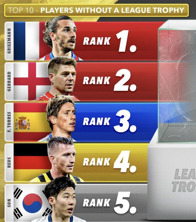 리그 트로피가 없는 선수 1위는 앙투안 그리즈만(아틀레티코 마드리드)이다.