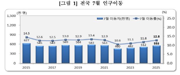 27일 통계청의 ‘2025년 7월 국내인구이동’에 따르면 지난 7월 이동자 수는 55만 3000명으로, 전년 동월 대비 8.1% 늘어났다. 이는 7월 기준 2021년 7월(56만 3000명) 이후 4년 만의 최고치다. 특히 지난 6월에 이어 인구이동자 수는 2개월째 증가세를 이어갔다.